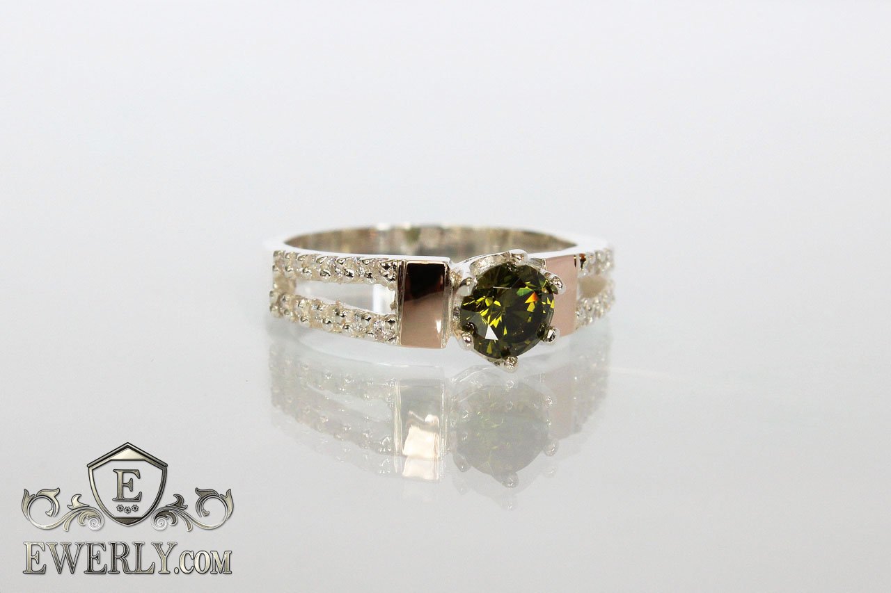 Женское cеребряное кольцо 925 пробы с золотыми вставками 375 пробы с камнем (цвет - олива).