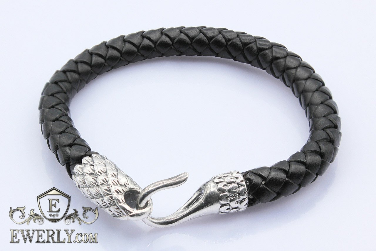 Мужской браслет из натуральной кожи с серебряным замком с рельефом в виде чешуи змеи.
