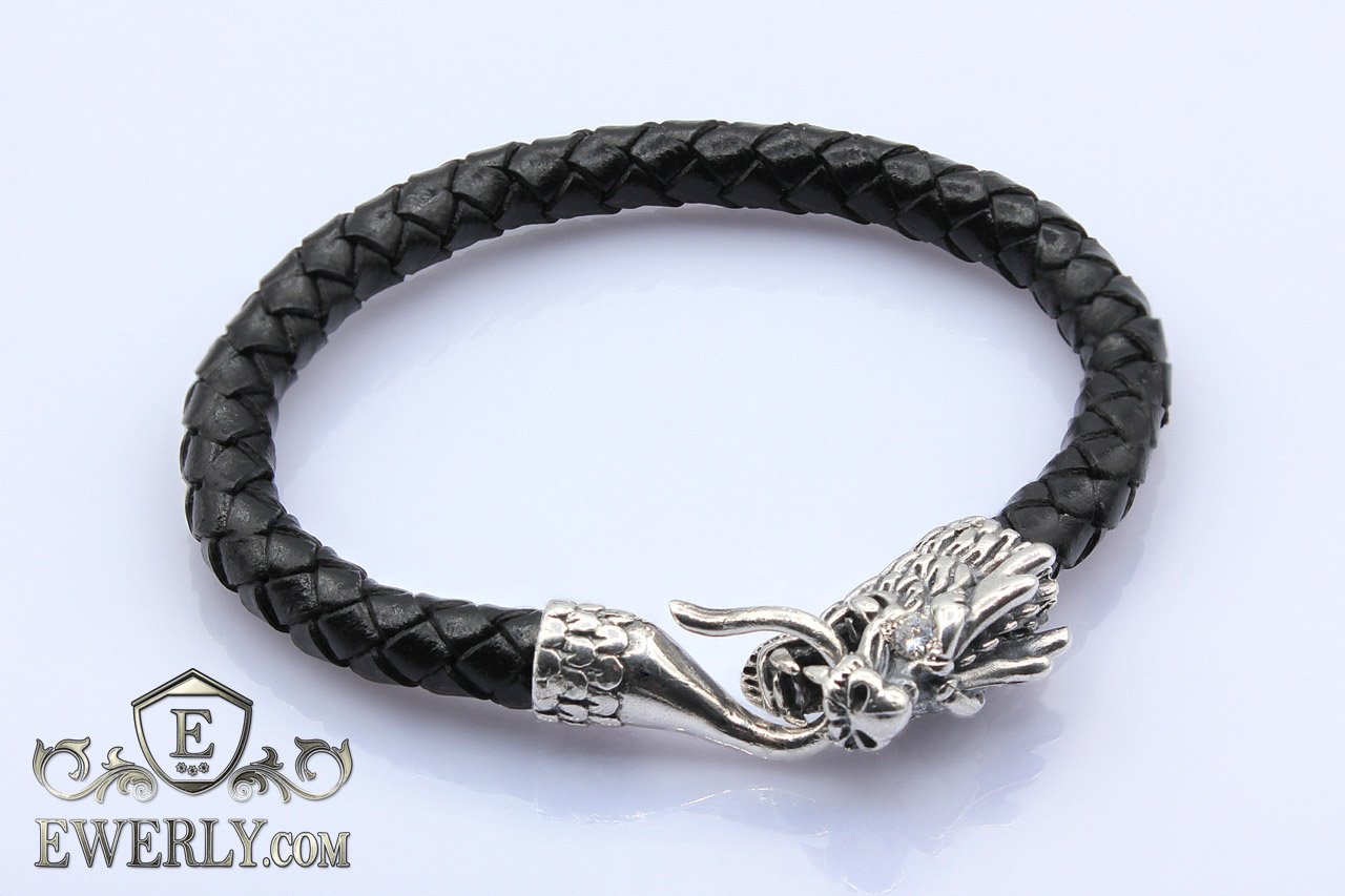 Мужской браслет из натуральной кожи с серебряным замком в виде дракона.