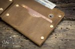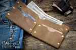 Бумажник имеет одно отделение под купюры всех номиналов и два отделения для банковских карт / визиток. Всего вмещается 4-6 карт в зависимости от их толщины, закрывается кошелёк с помощью двух кнопок изнутри.