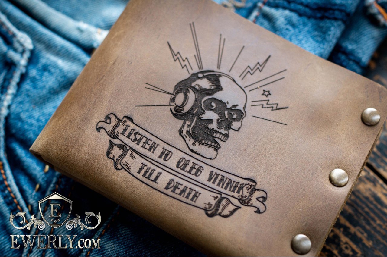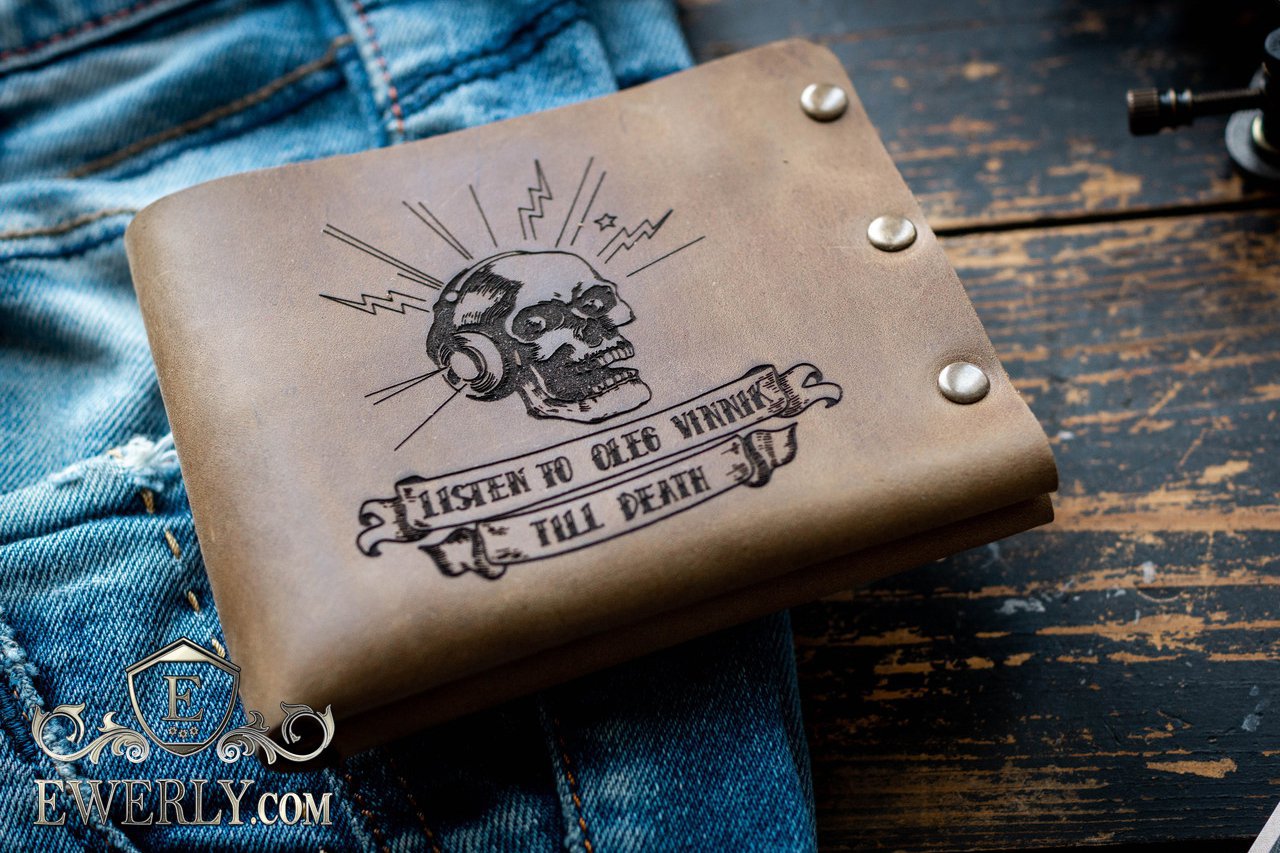 Полностью выполнен из натуральной кожи и металлических заклепок. Эксклюзивное мужское портмоне ручной работы, имеет эффект потёртости и лёгкой небрежности. Рисунок нанесён на кожу с помощью лазера (лазерная гравировка). Изготовлен в ограниченном выпуске.