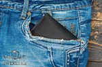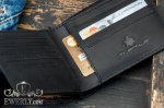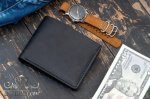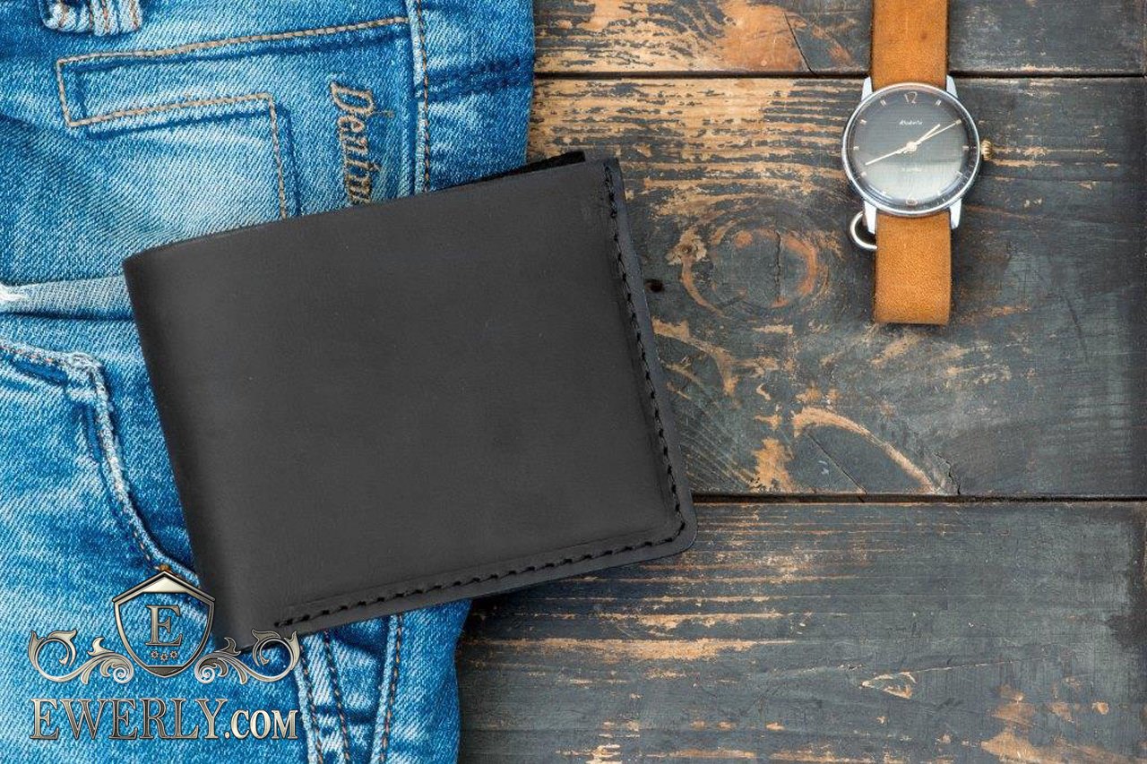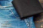 - Очень удобное и вместительное мужское кожаное портмоне чёрного цвета, полностью является ручной работой. Два раздела для бумажных денег, оба вмещают в себя купюры всех номиналов, в том числе самые крупные. Имеет восемь разделов под банковские, кредитные карты, визитки или водительское удостоверение. Есть кармашек для мелочи, или же его можно использовать для маленькой флешки или SD карты.