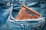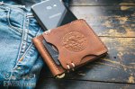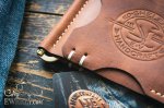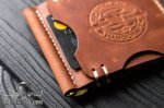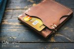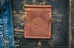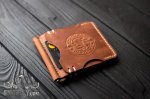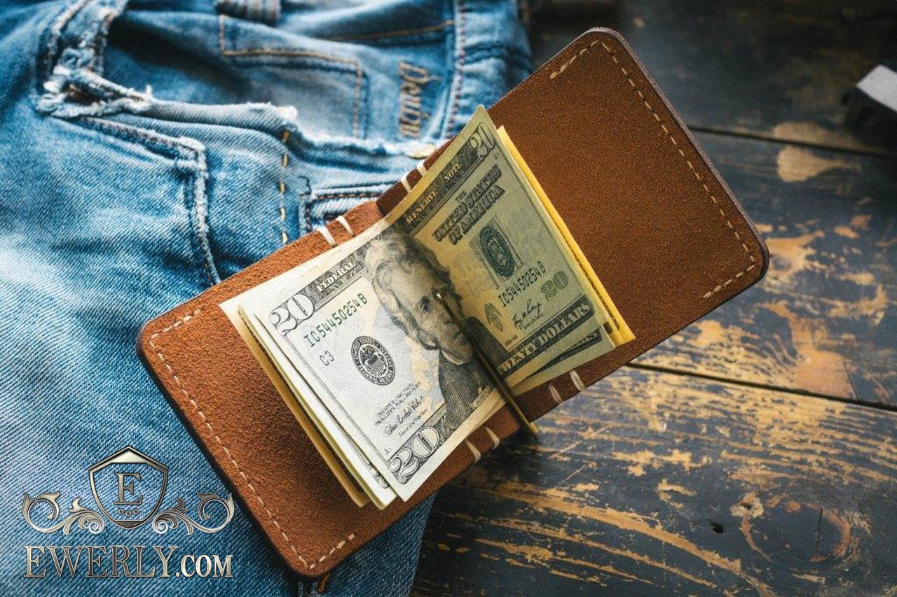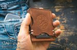 Практичный и удобный зажим для денег - ручная работа из натуральной кожи коричневого с красноватым оттенком цвета (коньячного) со вставками плетения вощеной нитью, выполнен для тех людей, кто не любит носить с собой пачки денег и кучу карт. Вмещает несколько бумажных купюр и имеет два отделения для банковских карт / визиток.