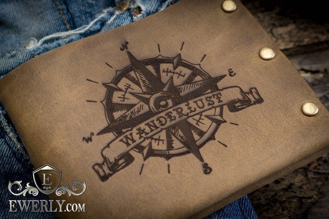 Полностью выполнен из натуральной кожи и металлических заклепок. Эксклюзивное изделие ручной работы, имеет эффект потёртости и лёгкой небрежности и изображением штурвала-компаса с надписью "WANDERLUST", что на русский переводится как "Cтрасть к путешествиям". Рисунок нанесён на кожу с помощью лазера (лазерная гравировка). Изготовлен в ограниченном выпуске.