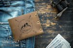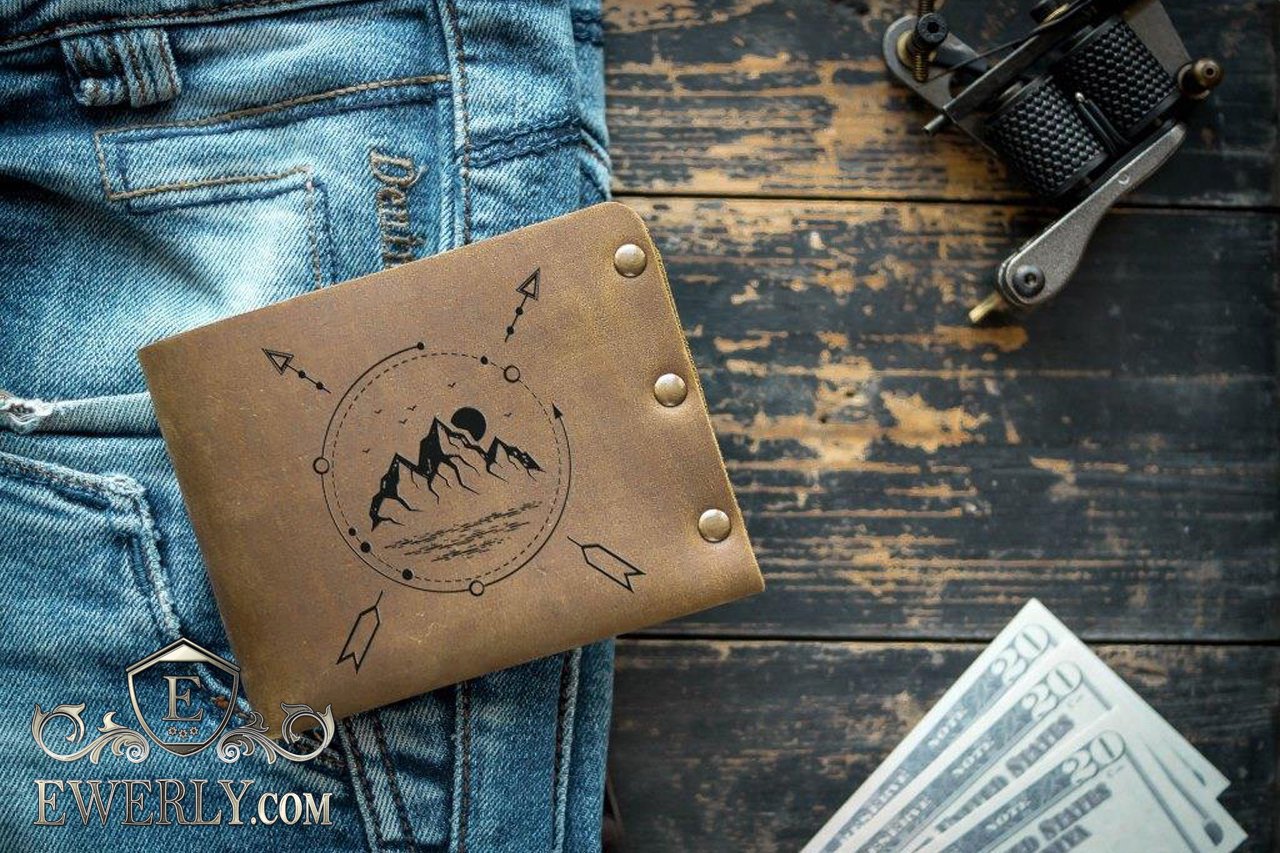 Полностью выполнен из натуральной кожи и металлических заклепок. Эксклюзивное изделие ручной работы, имеет эффект потёртости и лёгкой небрежности с выгравированным изображением гор. Рисунок нанесён на кожу с помощью лазера (лазерная гравировка). Изготовлен в ограниченном выпуске.