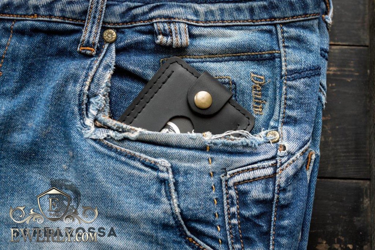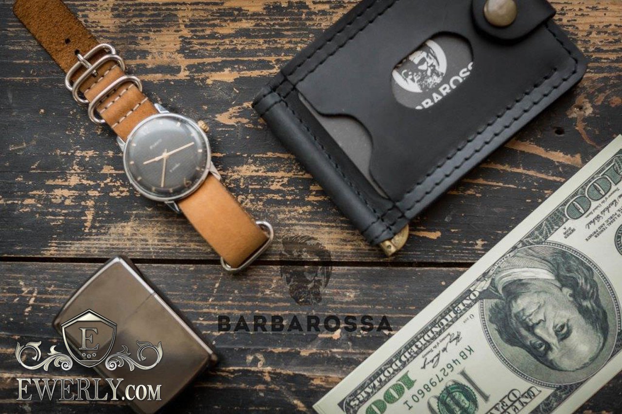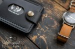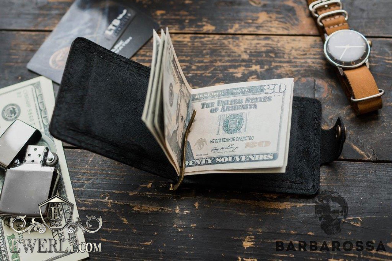 Мужской кожаный зажим для бумажных денег - изделие полностью ручной работы, изготовлен из натуральной кожи чёрного цвета. Имеет три раздела, два внешних из них для банковских карт или визиток и одно внутреннее отделение для купюр всех номиналов, в том числе самых крупных.