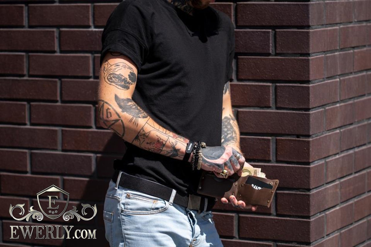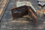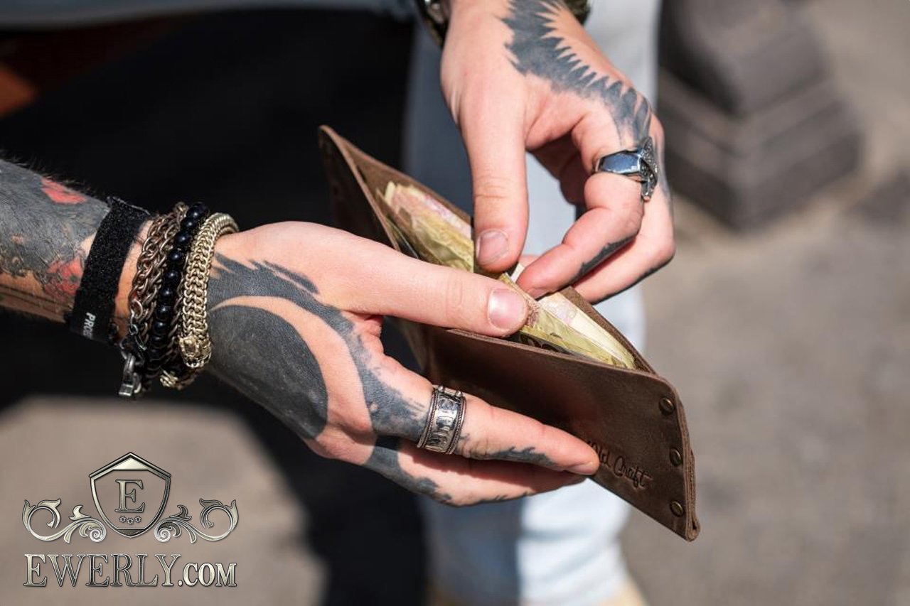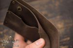 Мужской кошелёк ручной работы - изготовлен из натуральной кожи коричневого цвета и металлических заклепок. Чисто мужской кошелёк грубого помола высшего сорта! Имеет два отделения для банковских карт, каждое вмещает 2-3 карты, а также один раздел для бумажных денег под купюры всех номиналов.
