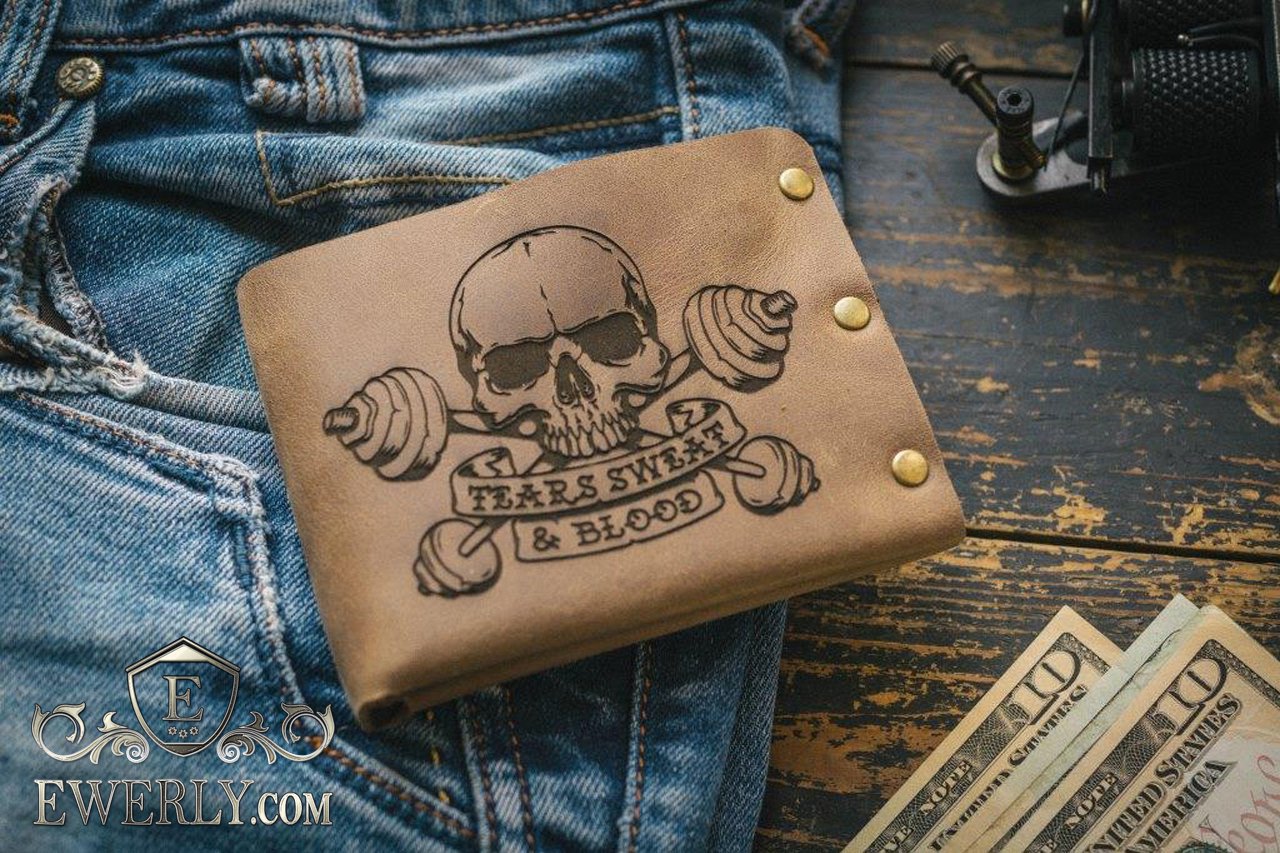 Кожаный кошелек для мужчины с изображением черепа и штанг