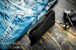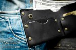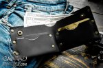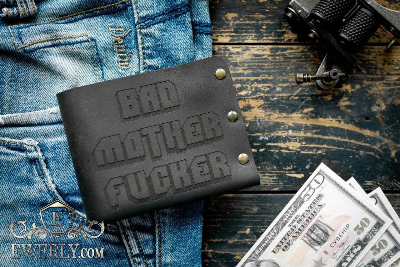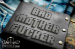 Полностью выполнен из натуральной кожи и металлических заклепок. Мужкое портмоне чёрного цвета ручной работы с надписью "BAD MOTHER FUCKER", в зависимости от контекста может нести разные смысловые значения, как "Плохой ублюдок", "Ох*енный пацан". Рисунок нанесён на кожу с помощью лазера (лазерная гравировка). Кошелёк имеет эффект потёртости и лёгкой небрежности. Изготовлен в ограниченном выпуске.