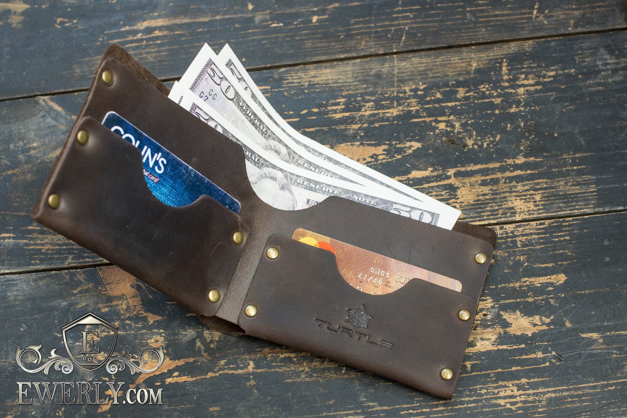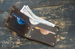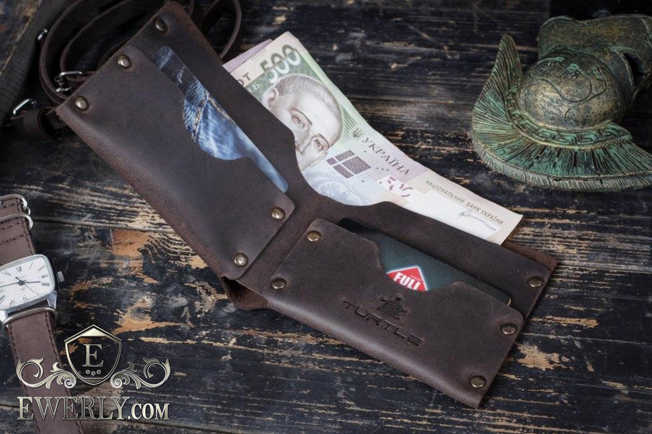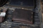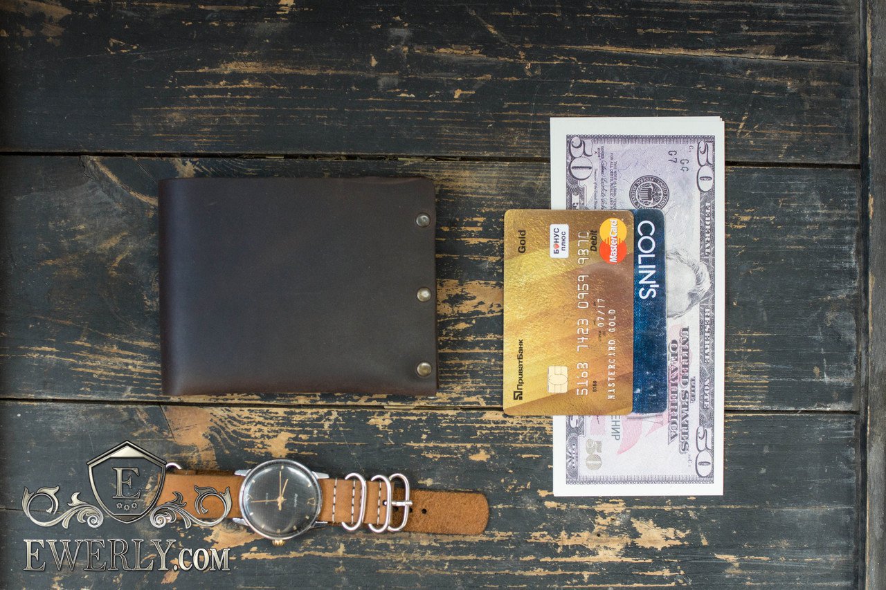 Данная модель кошелька изготовлена из натуральной винтажной кожи тёмно-коричневого цвета, на которой могут оставаться естественные царапины и потёртости. Любая такая царапина легко затирается рукой. Является максимально простым и доступным по цене бумажником. Имеет два раздела под карты или мелочь, а также один раздел под бумажные деньги, складывается вдвое и вмещает купюры всех размеров. Ничего лишнего!