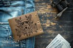 Полностью выполнен из натуральной кожи и металлических заклепок. Эксклюзивное изделие ручной работы, имеет эффект потёртости и лёгкой небрежности. Рисунок нанесён на кожу с помощью лазера (лазерная гравировка). Изготовлен в ограниченном выпуске.