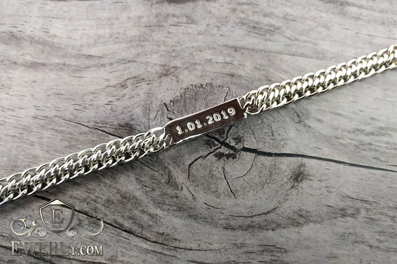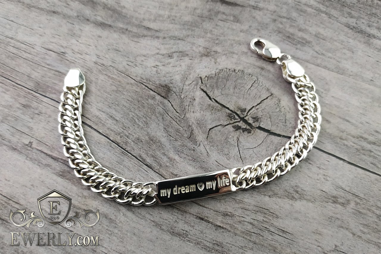Полновесный браслет. На фото изображён Двойной панцирный серебряный браслет с пластиной, также плетение имеет название "Десятка". Данная пластина имеет длину 3 см и гравировку с двух сторон: снизу "1.01.2019" и сверху "my dream ❤ мy life".