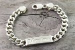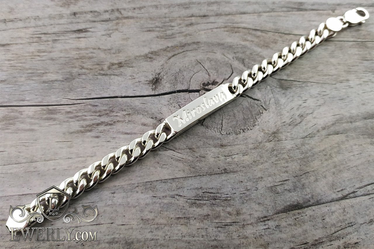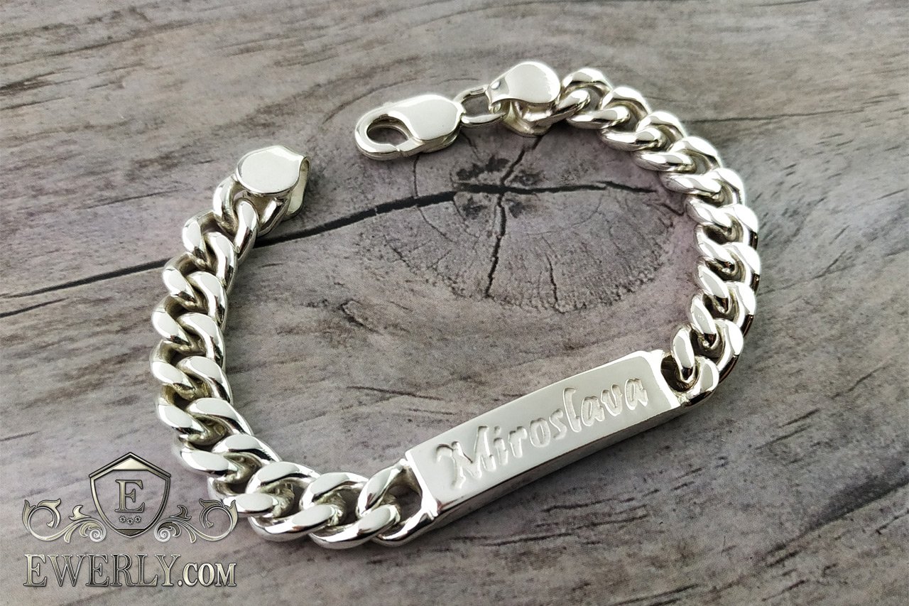 Полновесный браслет. На фото изображён Панцирный серебряный браслет с пластиной, данная пластина имеет длину 3 см и гравировку сверху "Miroslava".
