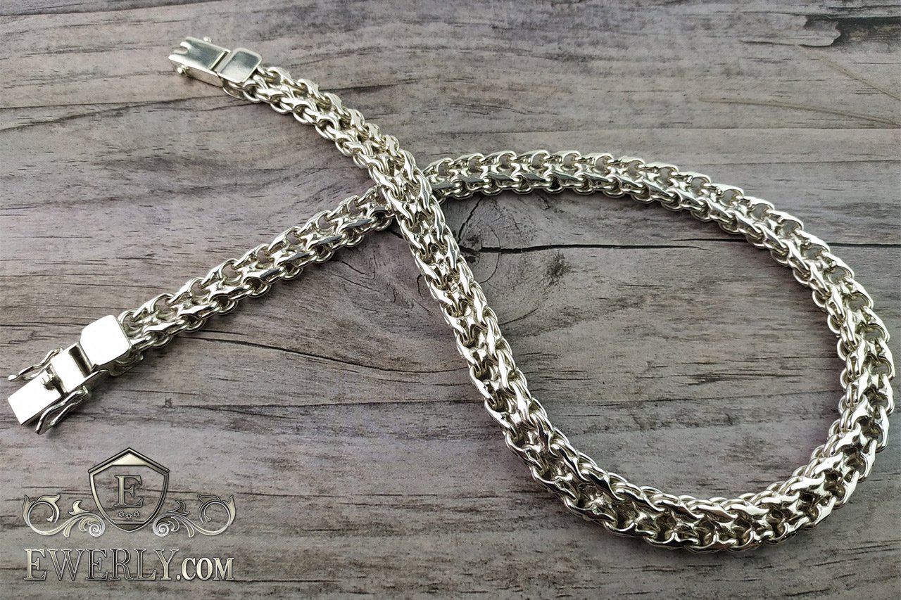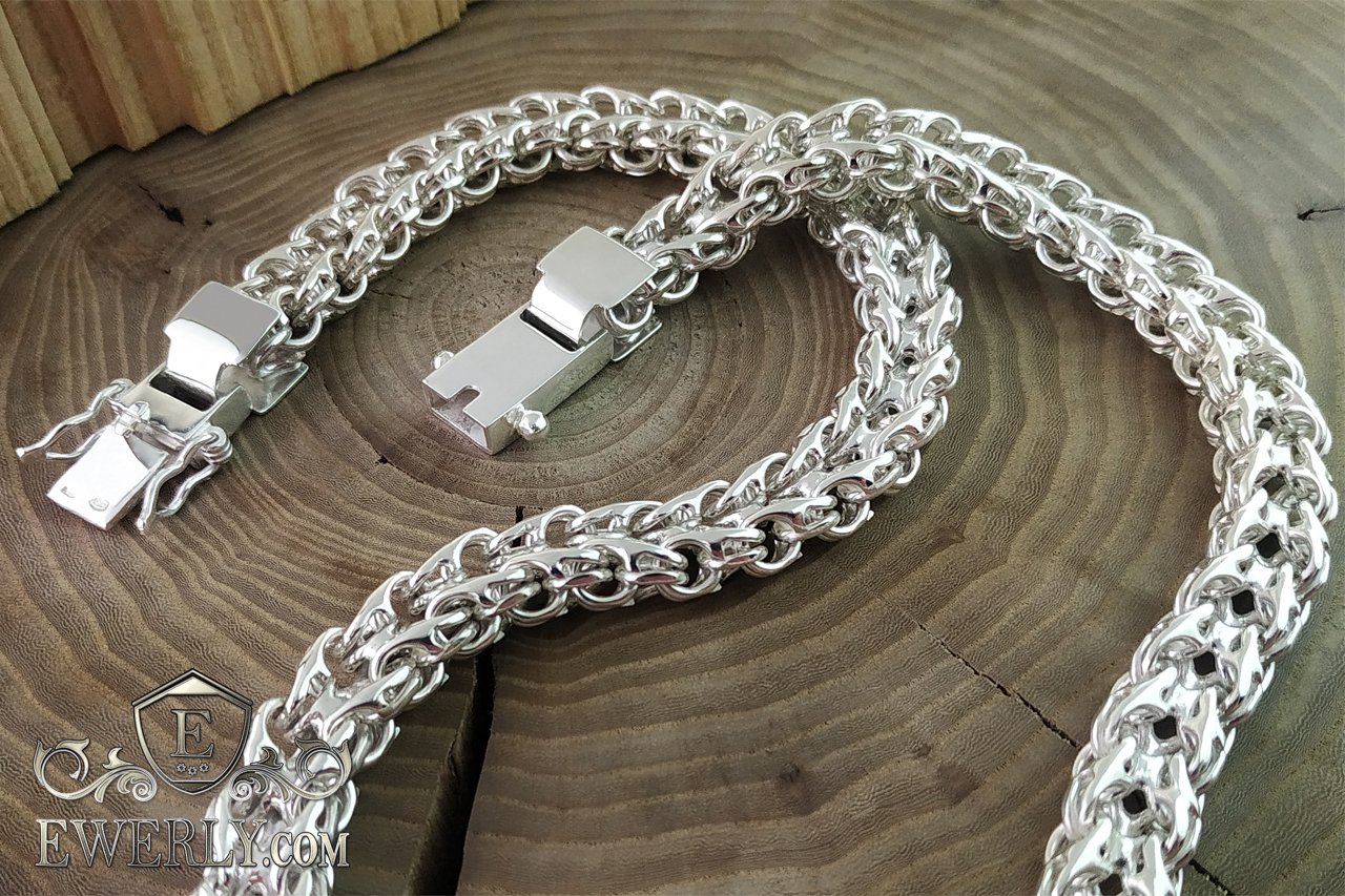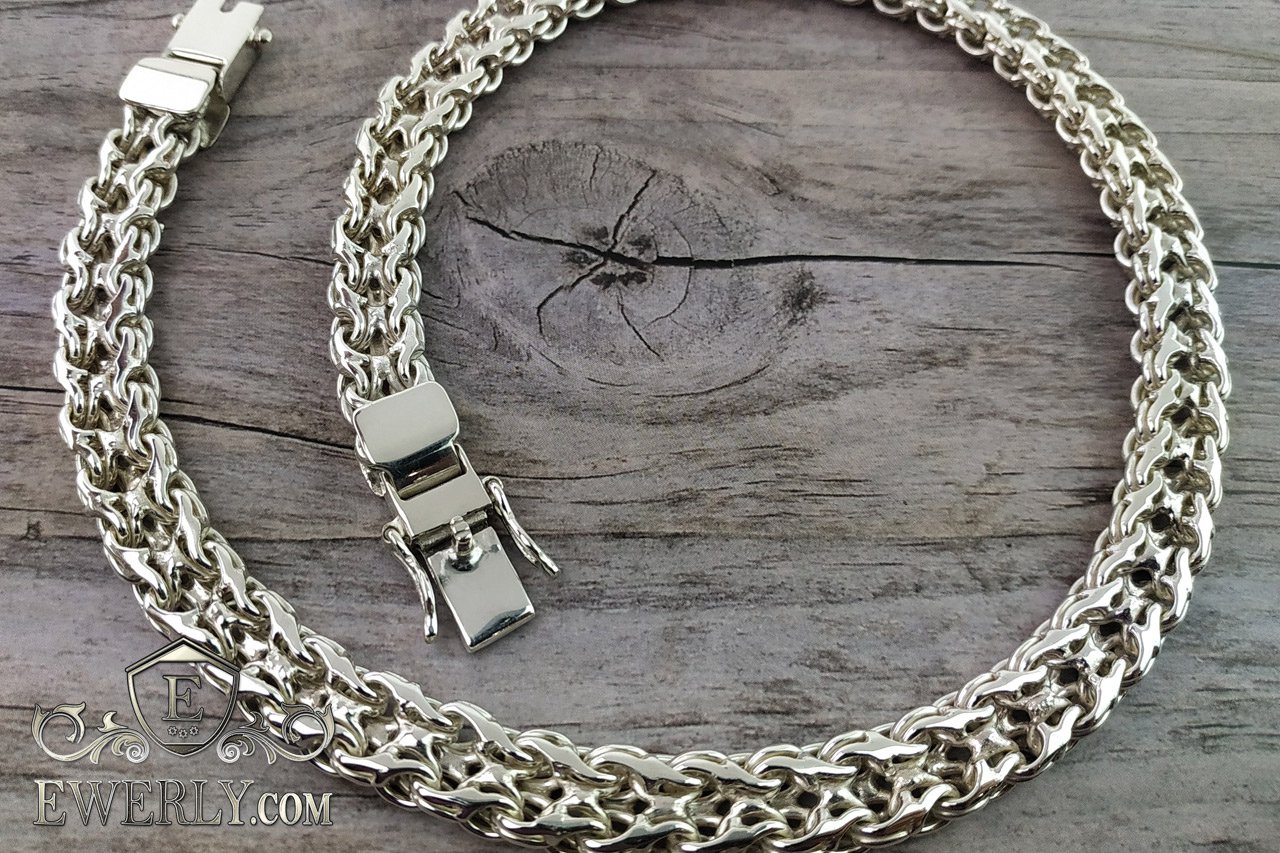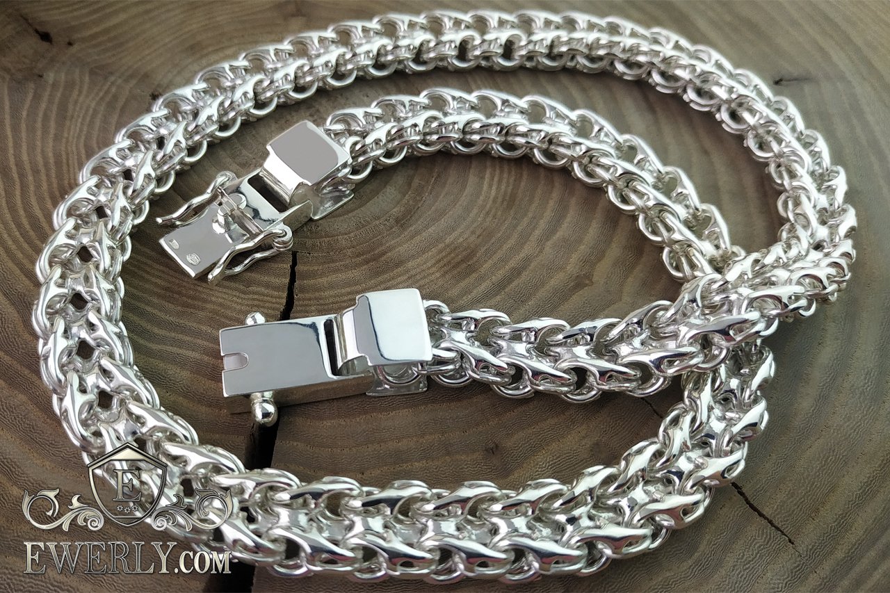 Полновесная серебряная цепочка на шею. Данное плетение достаточно трудоёмкое в исполнении, и большинство ювелиров не обладают достаточным уровнем навыков в изготовлении, чтобы достичь высокого качества украшений, не говоря уже о том, чтобы просто изготовить. На текущий момент качество наших работ из этого плетения существенно превосходит большинство других производителей.
