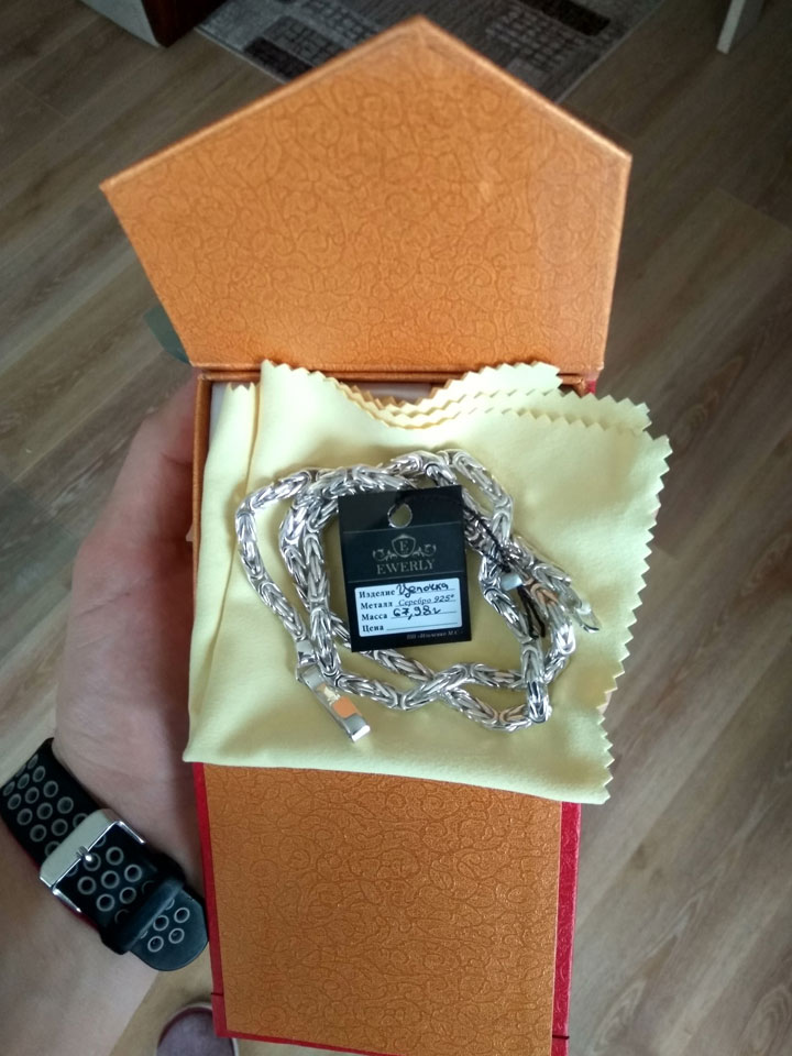 снова заказали цепь с тем же плетением, что и первый раз, но теперь толще и короче (4,5 мм толщина, 60 см длина). Очень довольны! Сделана безупречно, смотрится отлично! Благодарим!