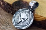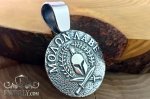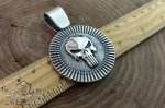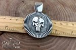 На фото изображён серебряный кулон из серебра 925 пробы. С одной стороны изображён Череп - сивол Карателя. Со второй стороны - спартанский шлем с фразой "MOΛΩN ΛABE", произносится как "молон лабе".
