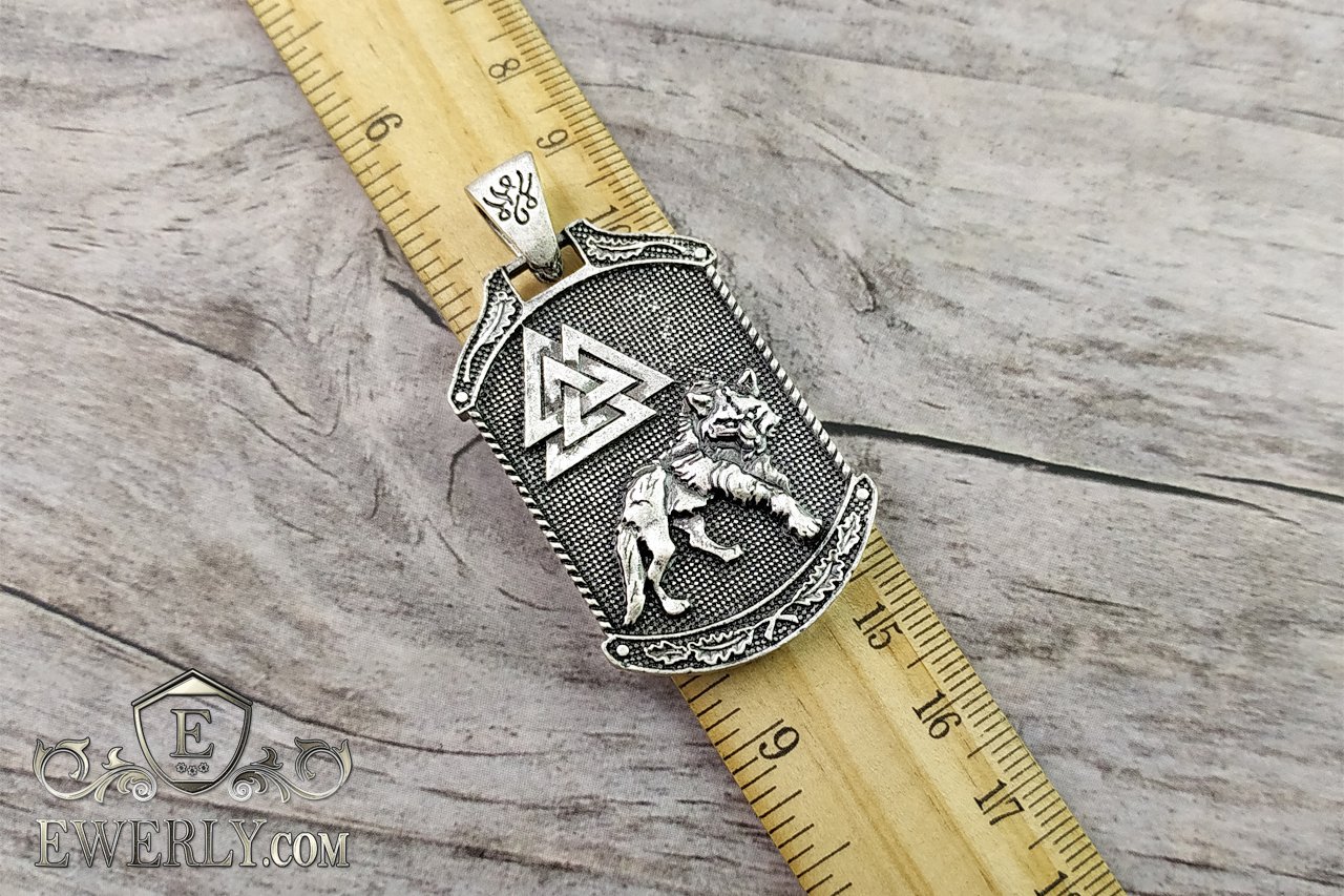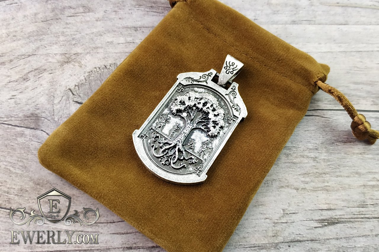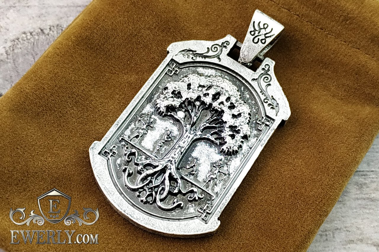 Подвеска - кулон "Дерево жизни" с волком из серебра, амулет на шею