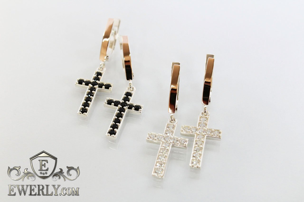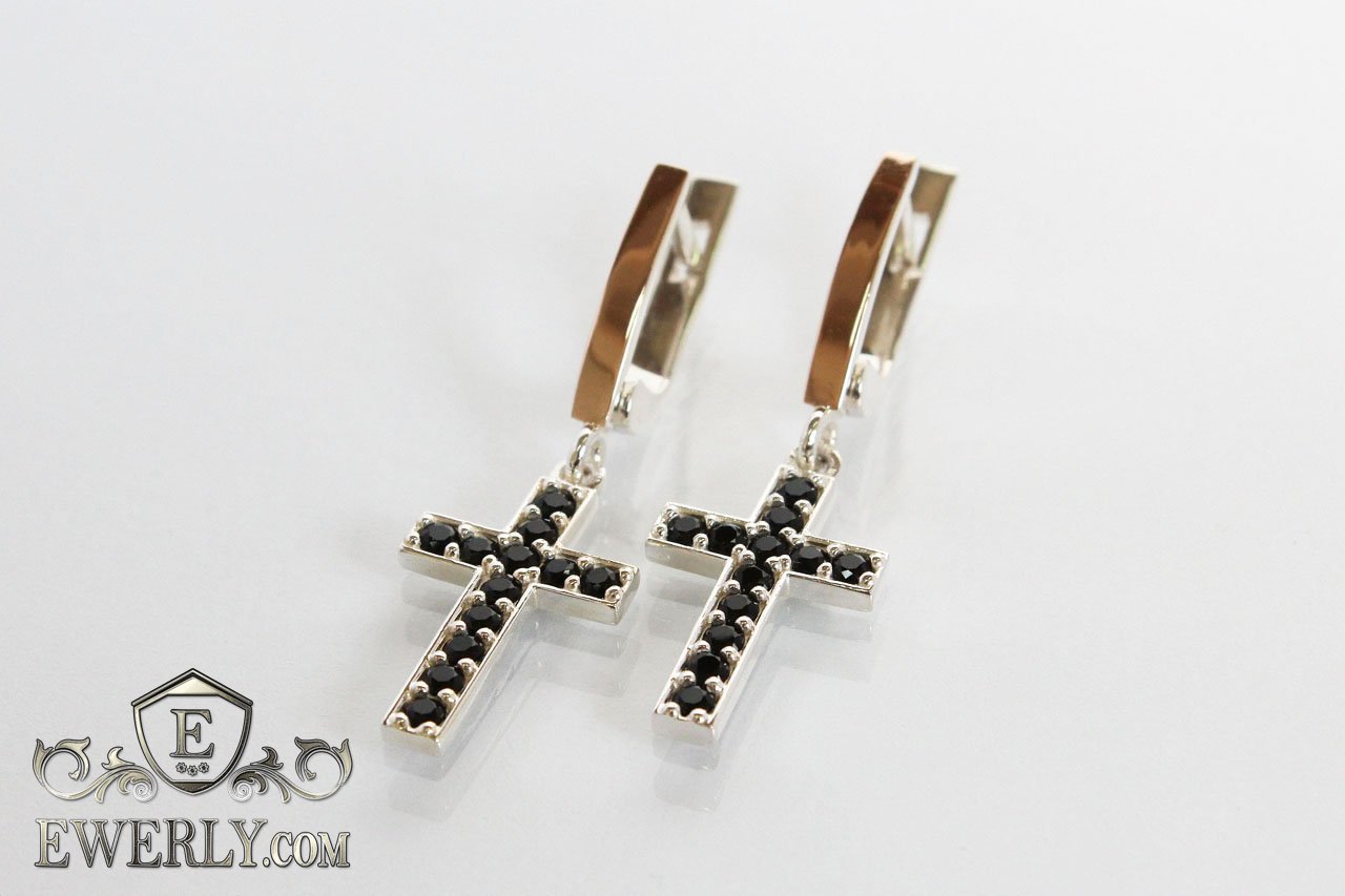 Женские серебряные серёжки - кресты из серебра 925 пробы с седцем и с золотыми вставками 375 пробы, камни чёрного цвета.