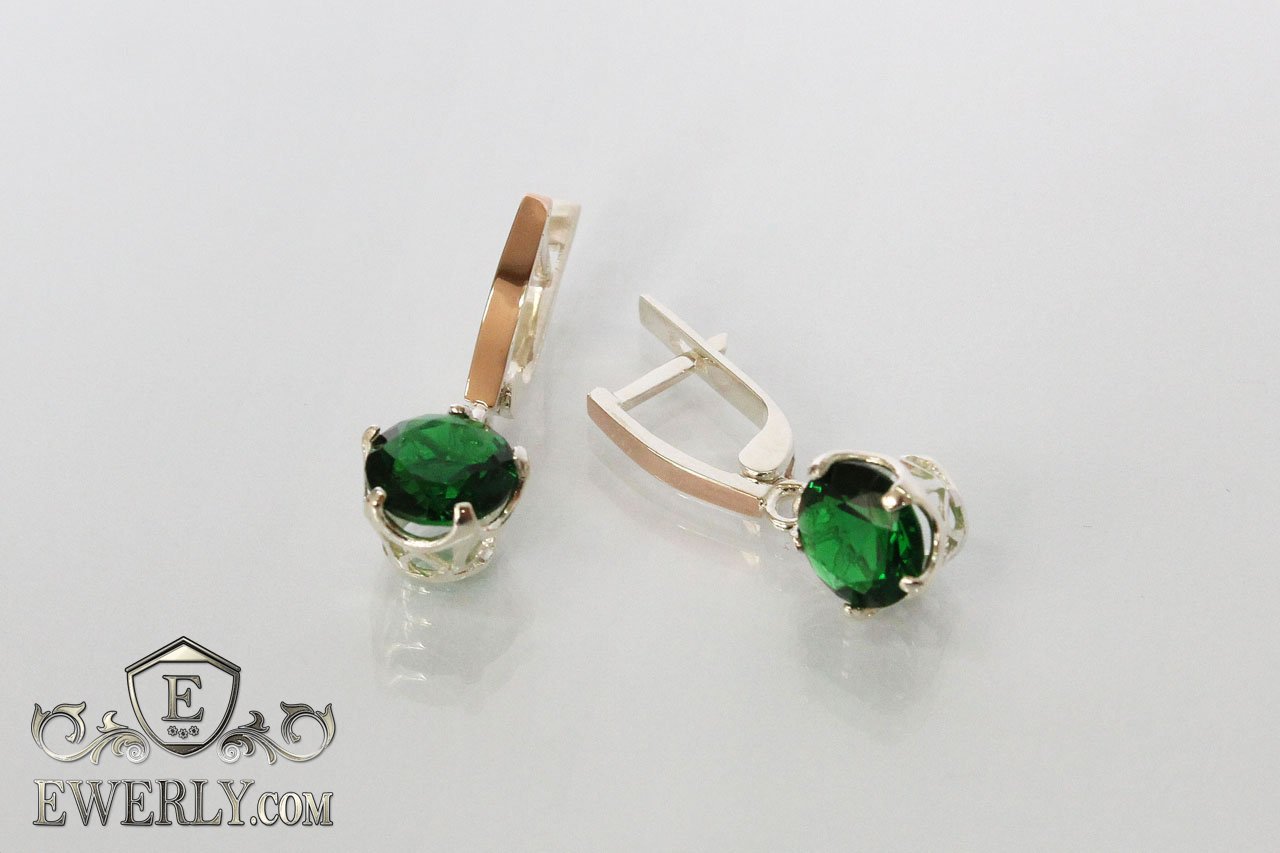 Серёжки из серебра 925 пробы для девушки с золотыми вставками 375 пробы и зелёными камнями - фианитами.