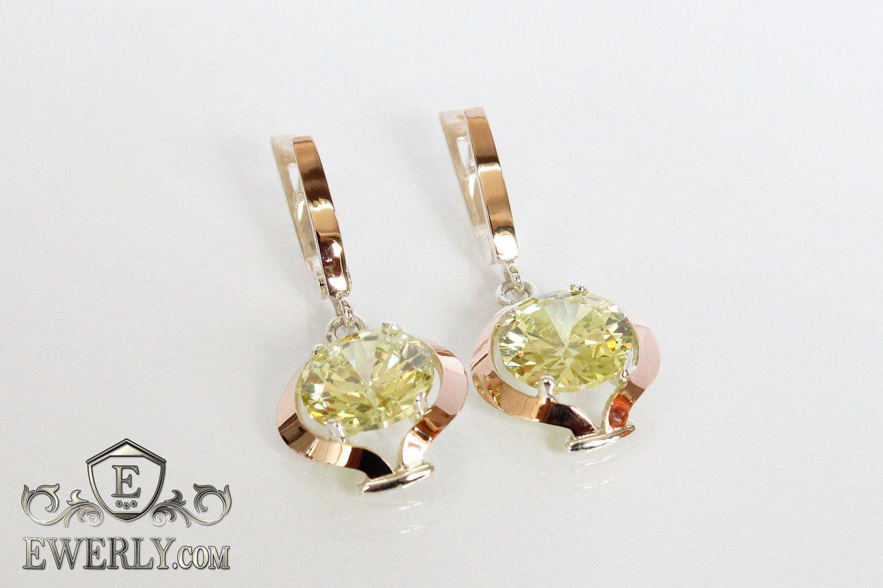 Серебряные серёжки 925 пробы для девушки с золотыми вставками 375 пробы и камнями - фианитами (цвет-цитрин).