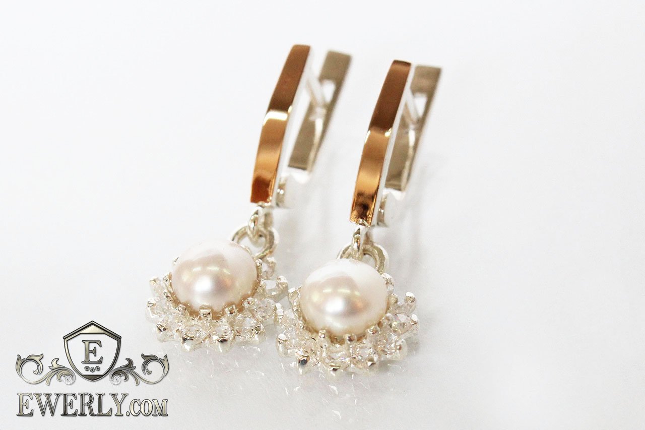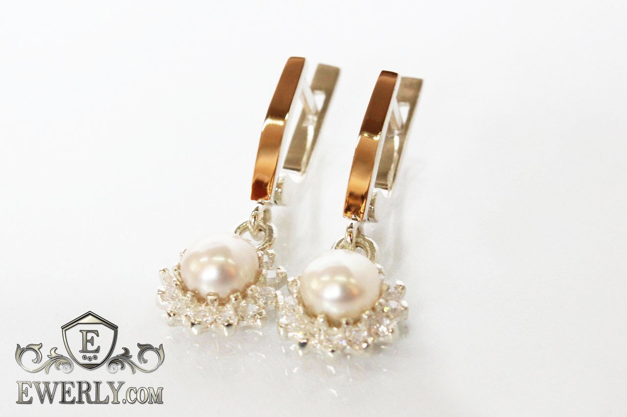 Серебряные серёжки для женщин с золотом 375 пробы, серебро 925 пробы (белые фианиты в виде жемчуга).