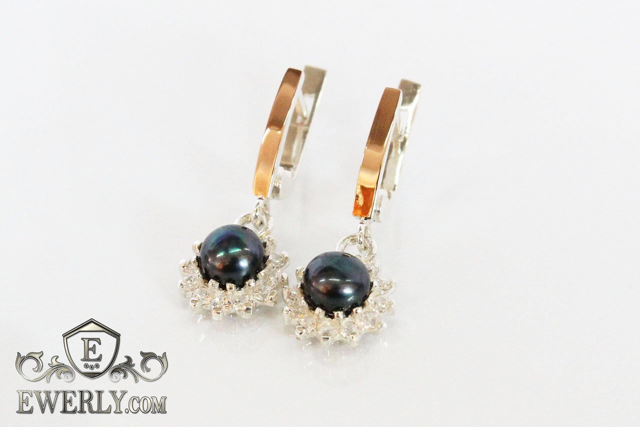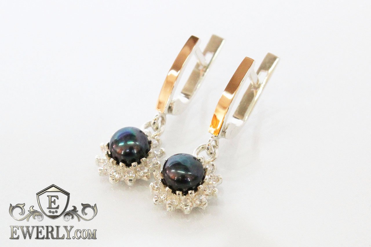 Серебряные серёжки для женщин с золотом 375 пробы, серебро 925 пробы (чёрные фианиты в виде жемчуга).