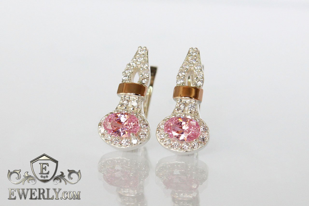 Женские серебряные серьги в виде капли, серебро 925 пробы с золотыми пластинами 375 пробы (розовые фианиты).