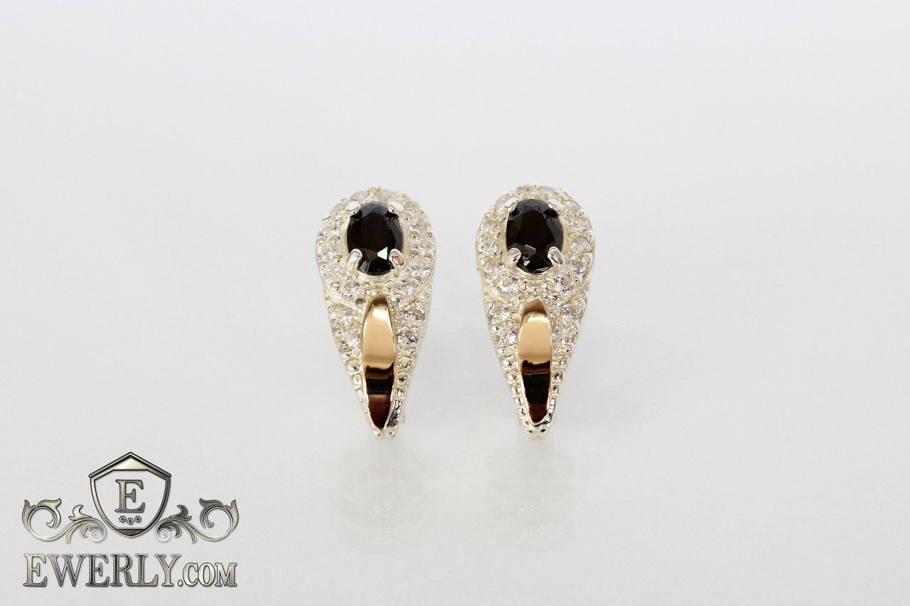 Женские серебряные серьги в виде капли, серебро 925 пробы с золотом 375 пробы и чёрными камнями - фианитами.
