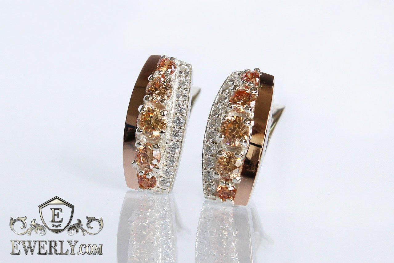 Серебряные серьги с камнями (цвет-шампань) для девушки