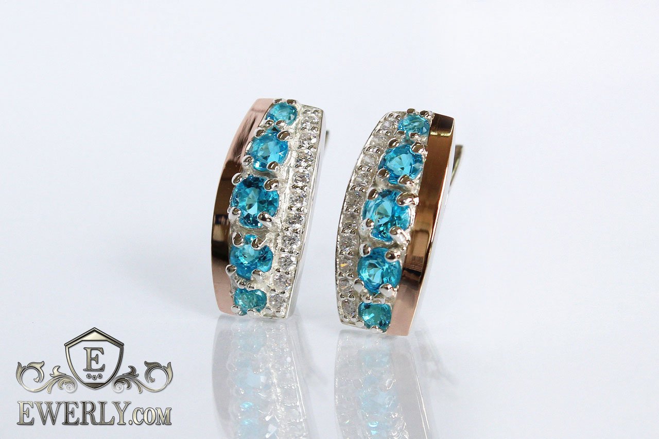 Серебряные серьги 925 пробы для девушки с золотыми пластинами 375 пробы с голубыми камнями (фианиты).