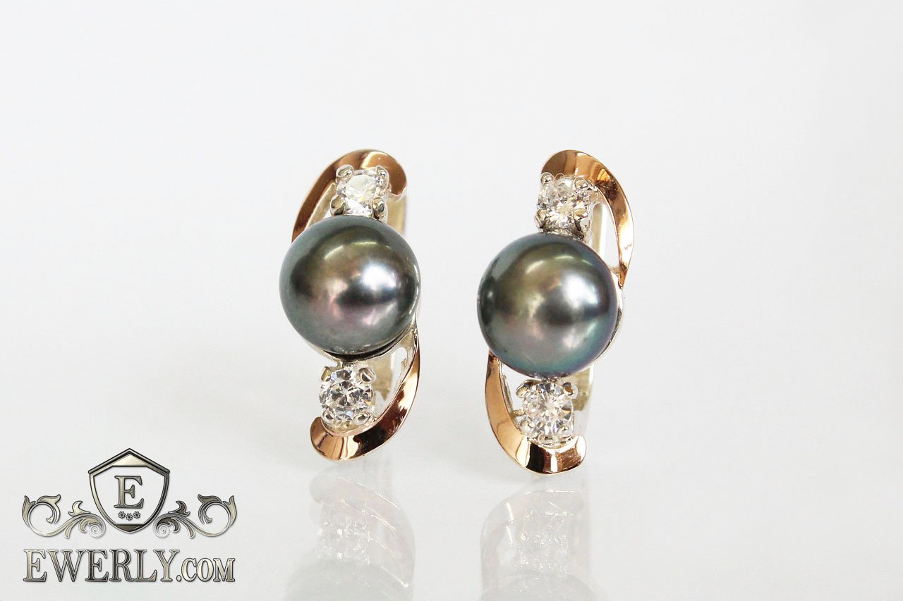 Женские серебряные серьги с искусственным чёрным жемчугом (фианиты) и золотом 375 пробы.