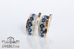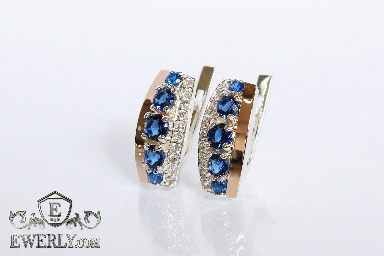 Серебряные серьги 925 пробы для девушки с золотыми пластинами 375 пробы с синими камнями (фианиты).