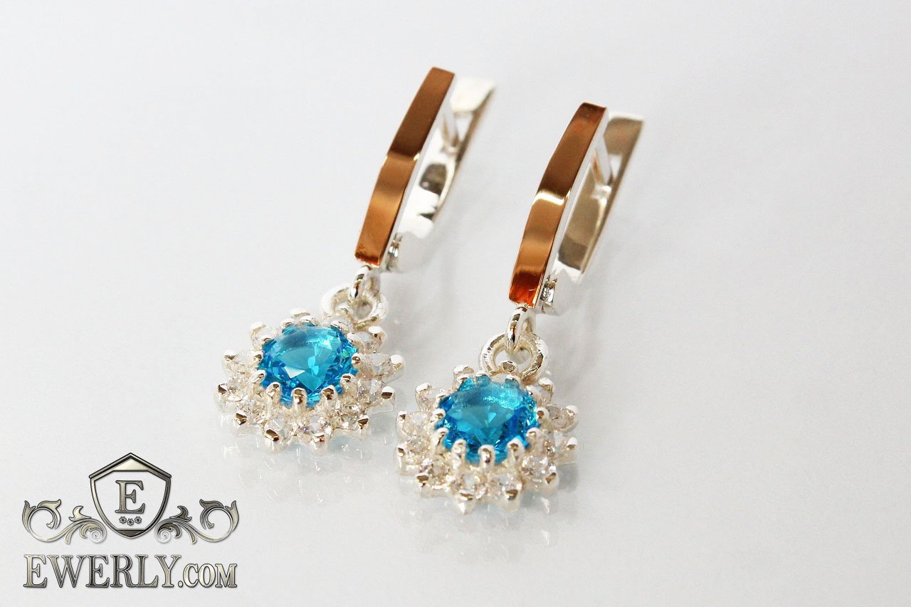 Серёжки из серебра с голубыми камнями для девушки (золотые вставки)