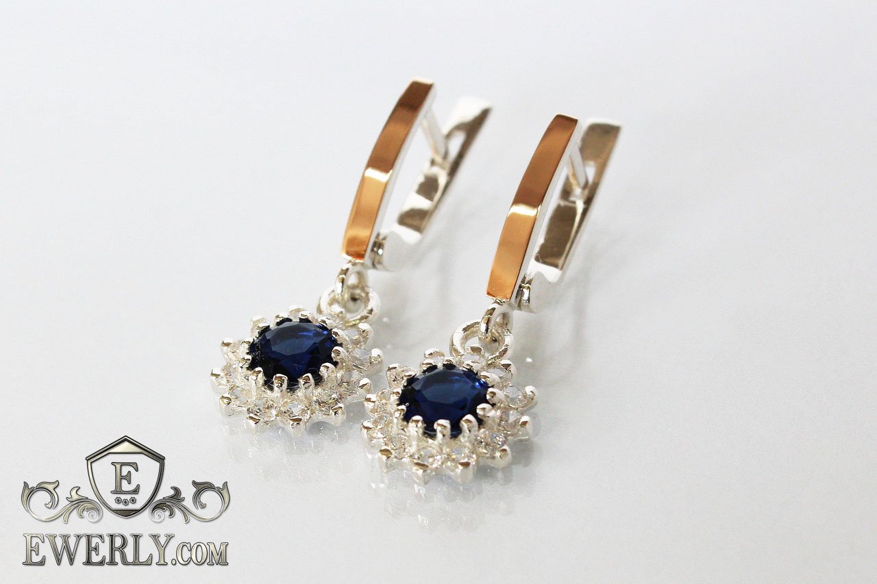Серёжки из серебра 925 пробы для девушки с золотыми вставками 375 пробы и синими камнями - фианитами.