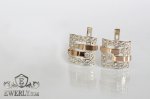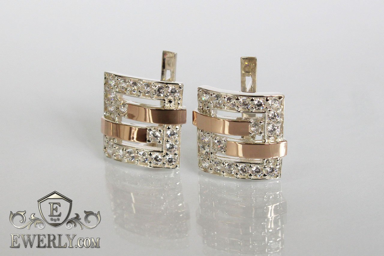 Широкие женские серьги из серебра 925 пробы с золотыми вставками 375 пробы с белыми фианитами.