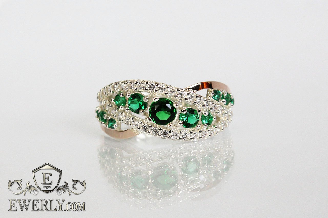 Серебряное кольцо из серебра 925 пробы с золотыми вставками 375 пробы и зелёными камнями (фианиты) для девушки.