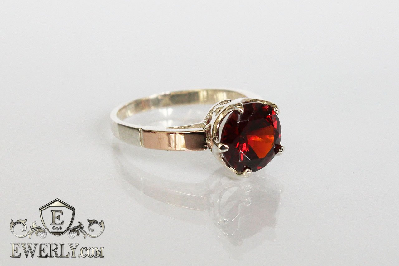 Женское cеребряное кольцо 925 пробы с золотыми вставками 375 пробы с камнем (фианит красного цвета).