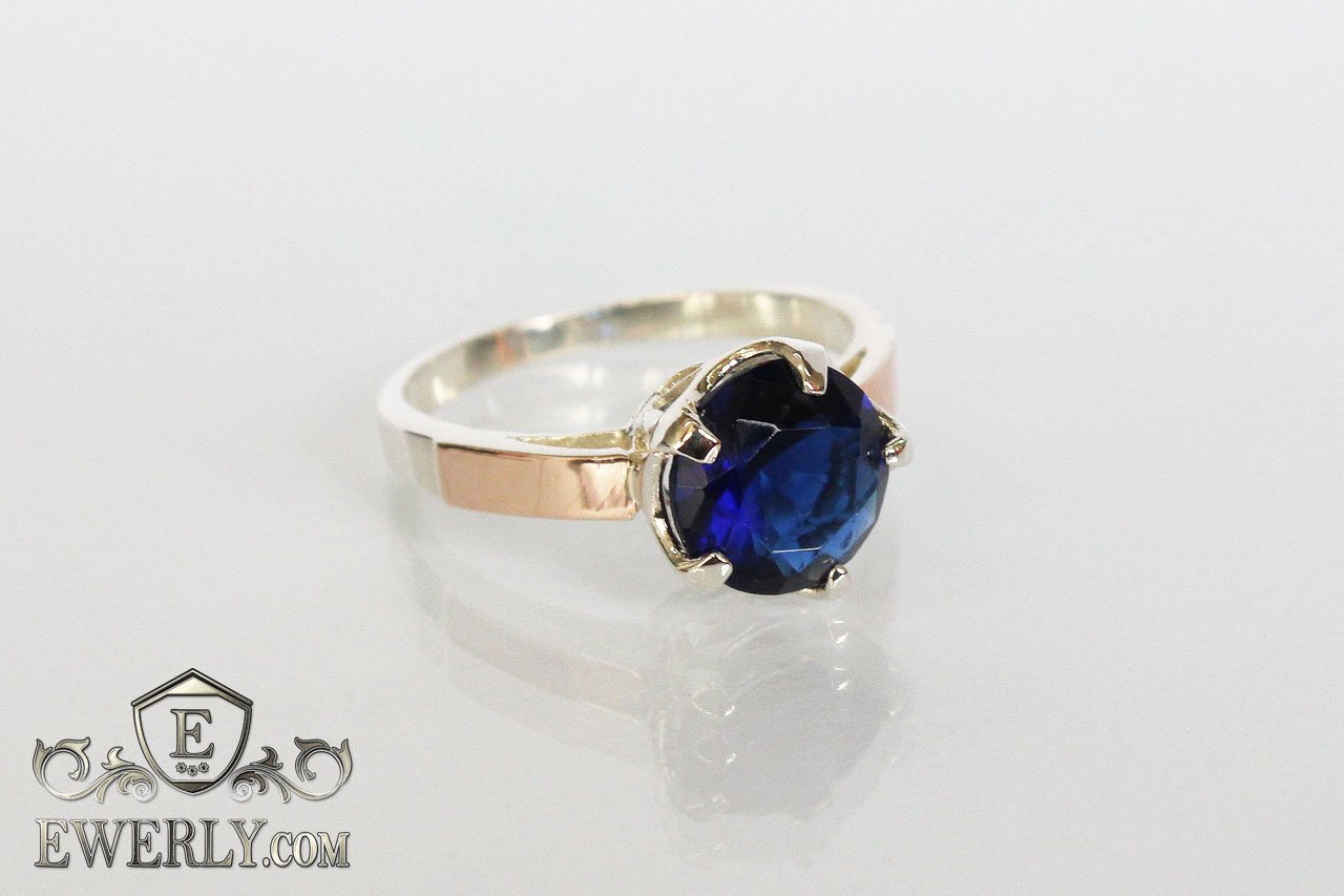 Серебряное кольцо с золотыми вставками и фианитом (цвет - синий)