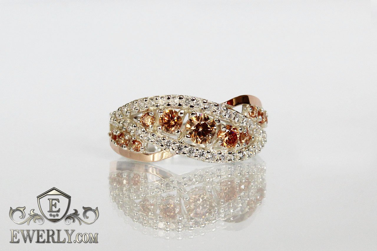 Красивое кольцо из серебра 925 пробы с золотыми вставками 375 пробы и камнями цвета шампань для девушки.