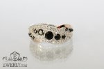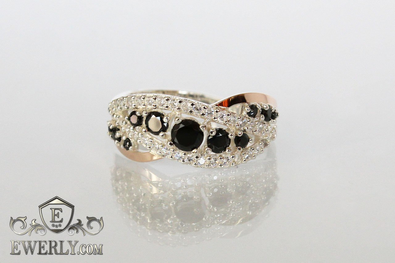 Женское серебряное кольцо из серебра 925 пробы с золотыми вставками 375 пробы и чёрными камнями (фианиты).