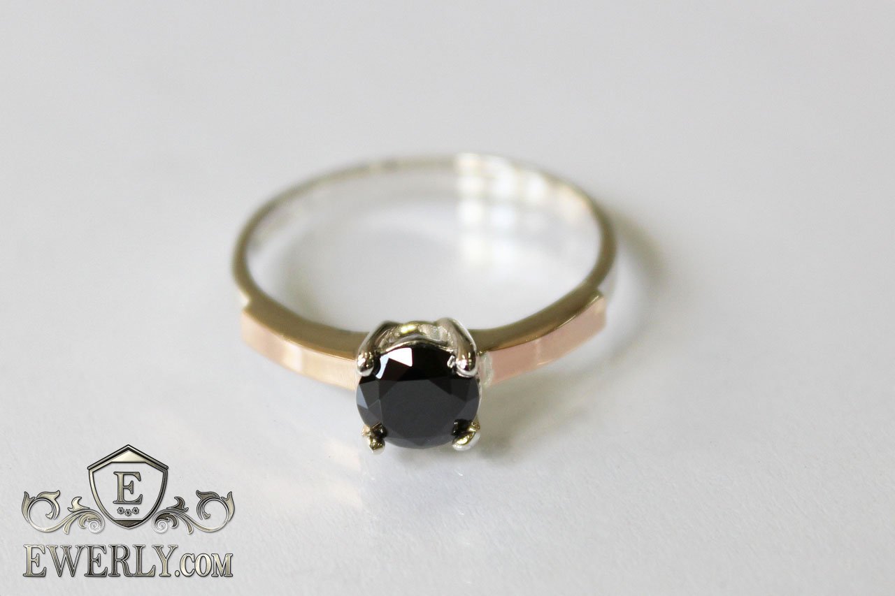 Женское серебряное кольцо 925 пробы с золотыми пластинами 375 пробы с фианитом (чёрный цвет).