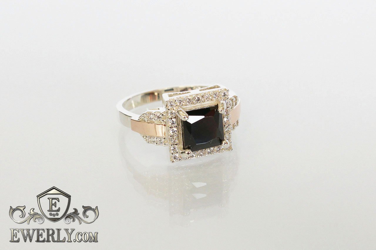 Женское серебряное кольцо с золотом и чёрным фианитом квадратной формы