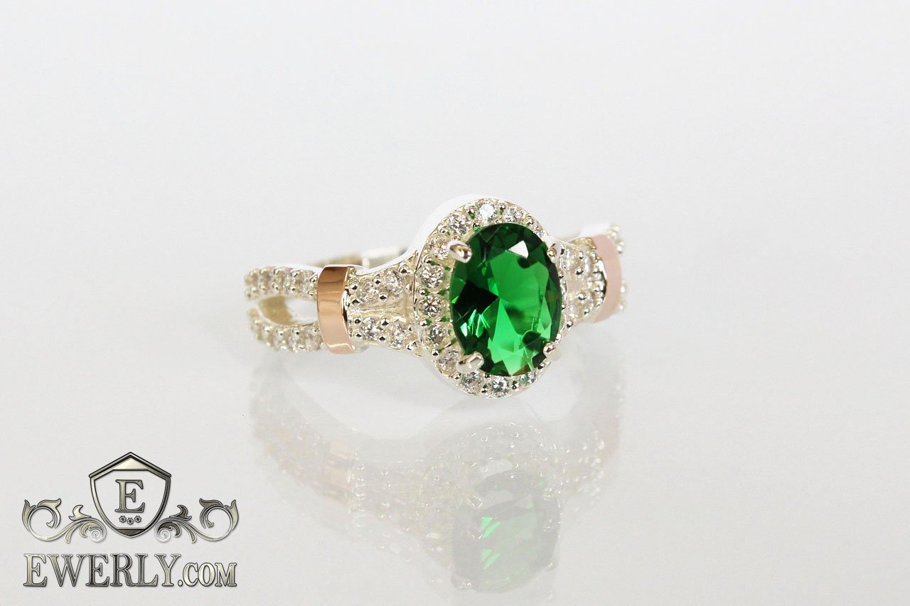 Серебряное кольцо для девушки 925 пробы с золотыми пластинами 375 пробы с зелёным камнем.
