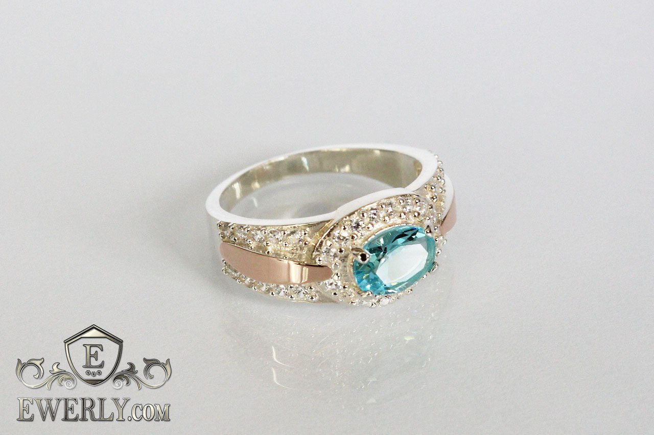 Женское серебряное кольцо 925 пробы с золотыми пластинами 375 пробы с овальным камнем светло-голубого цвета.