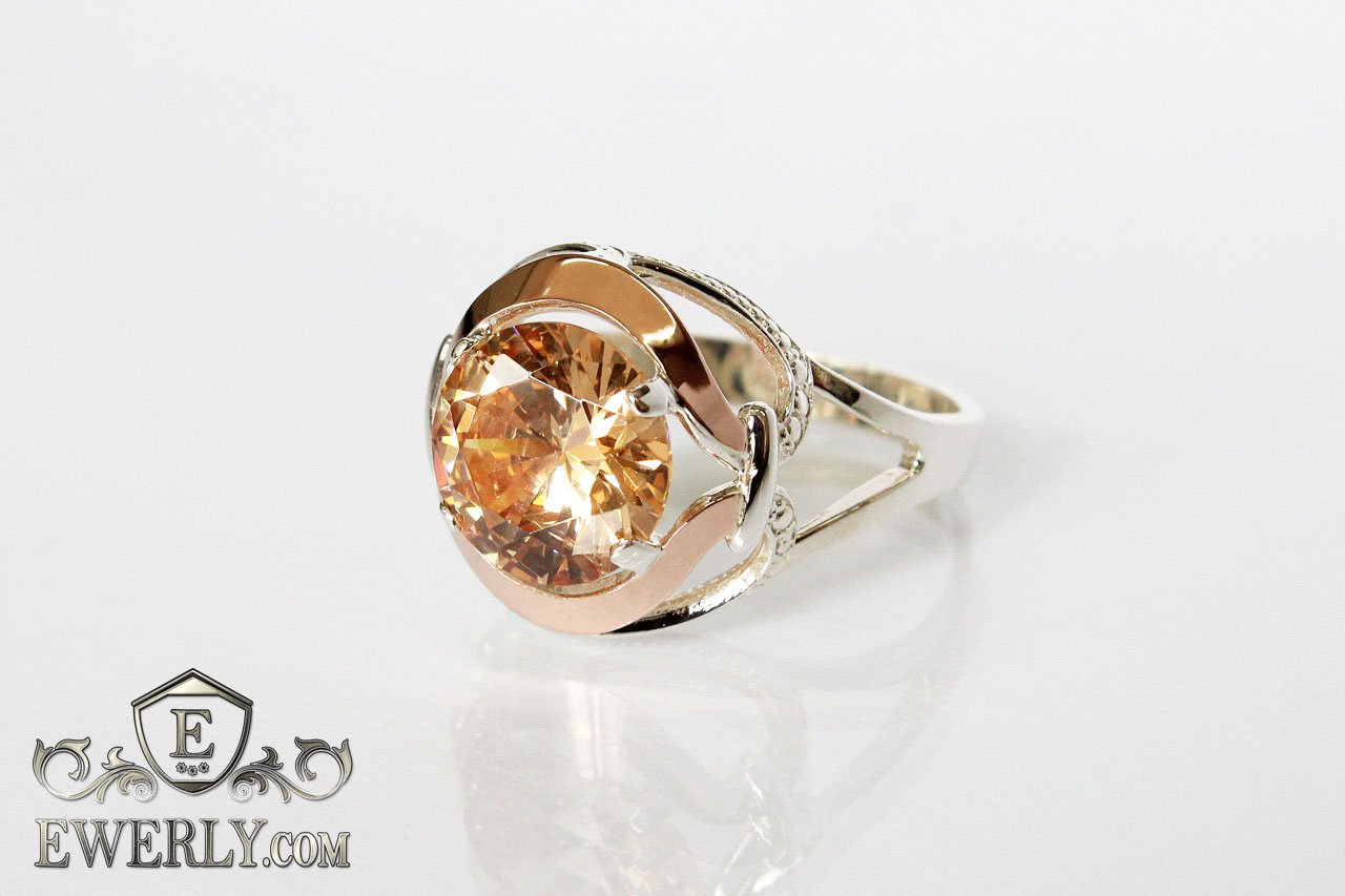 Кольцо из серебра 925 пробы с золотом 375 пробы и фианитом цвета - шампань для женщин.