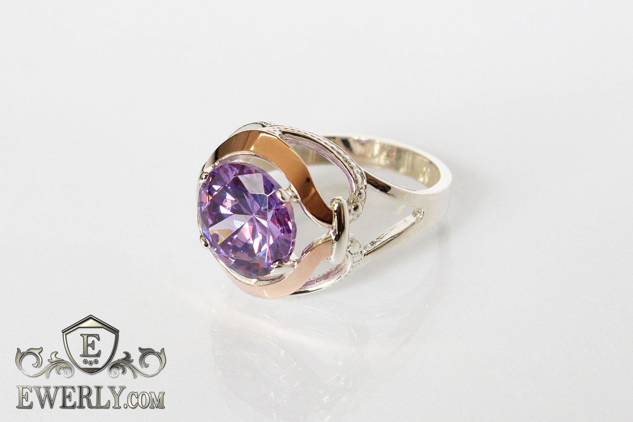 Кольцо из серебра 925 пробы с золотом 375 пробы с фианитом аметистового цвета для женщины.