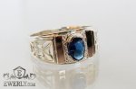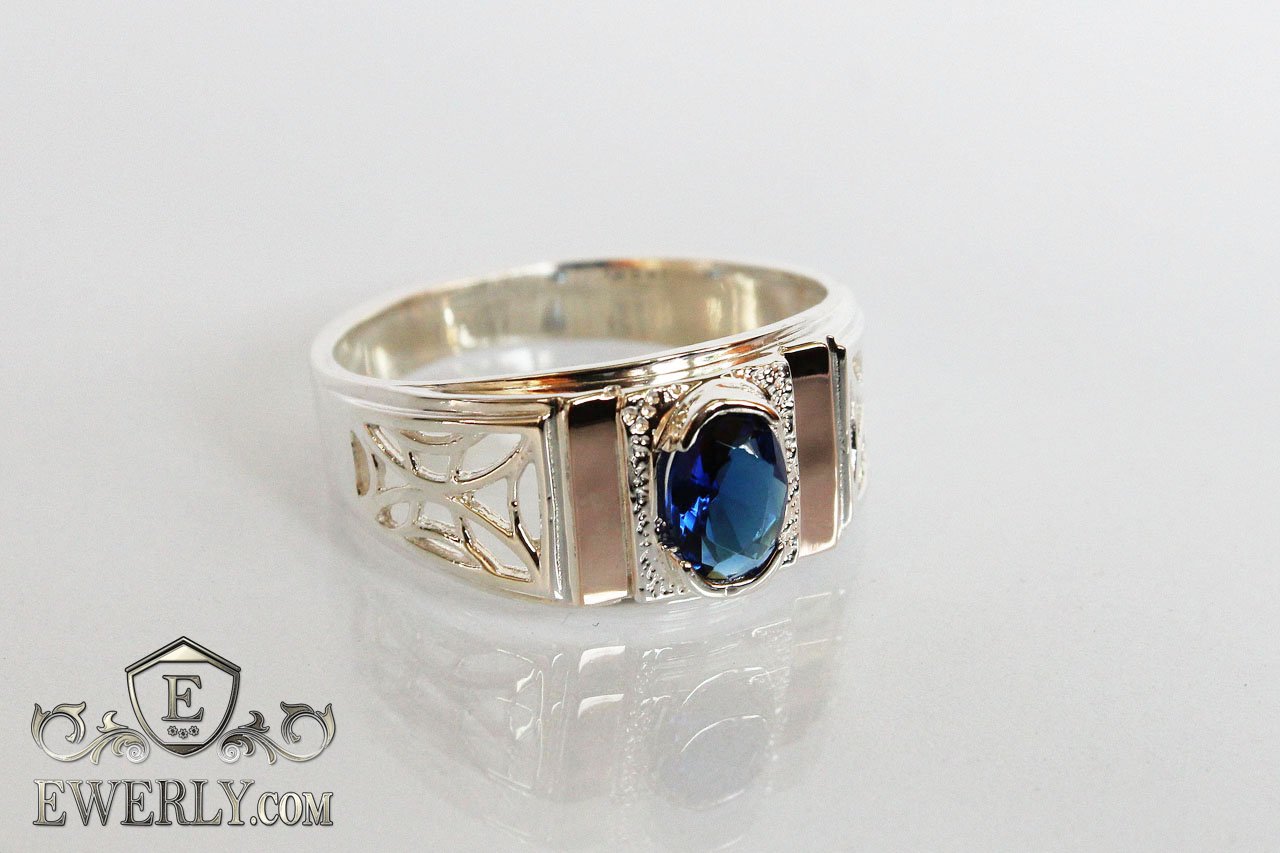Мужской перстень из серебра 925 пробы с золотом 375 пробы и вставкой - синим камнем (фианит).