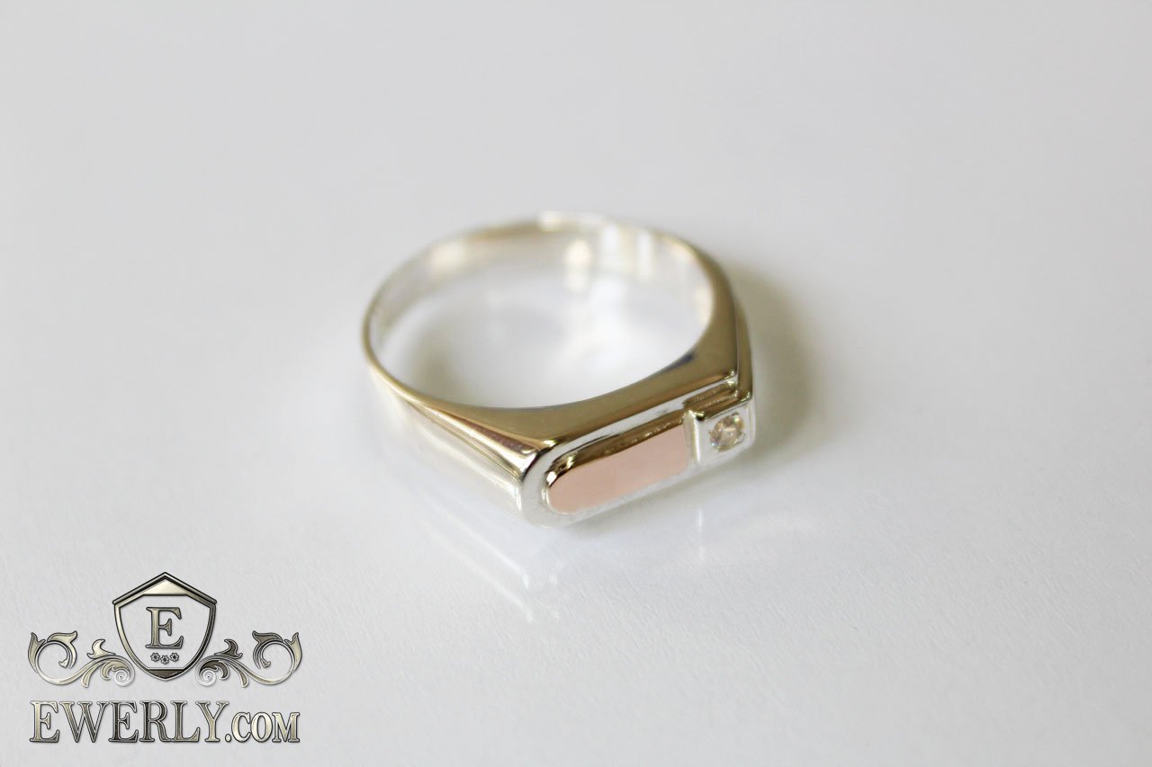 Мужской перстень из серебра 925 пробы с золотыми напайками 375 пробы и белым камнем - фианитом.