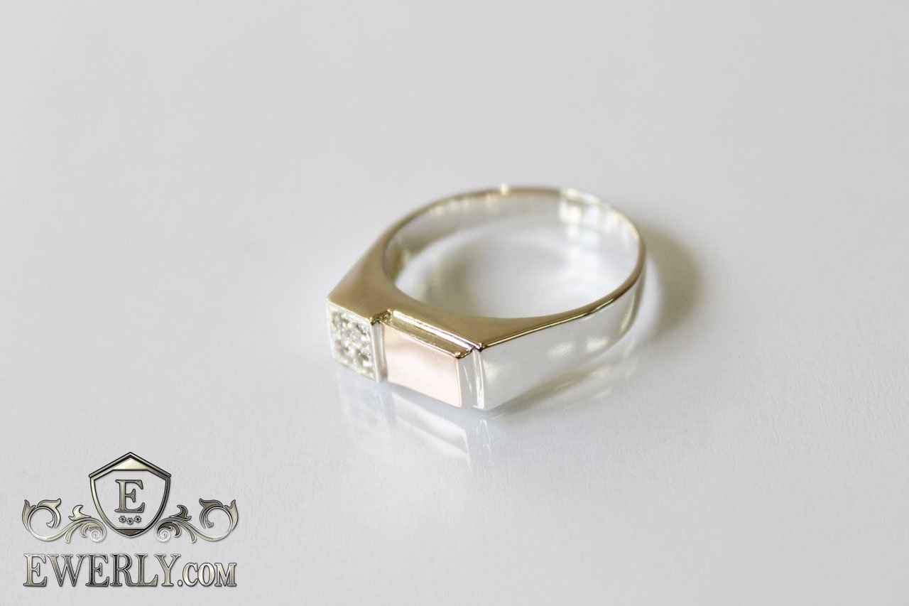 Мужской серебряный перстень 925 пробы с золотыми вставками 375 пробы и белыми камнями - фианитами.