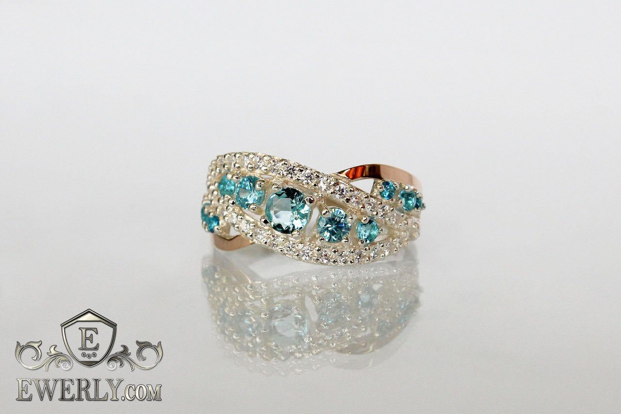Серебряное кольцо из серебра 925 пробы с золотыми вставками 375 пробы и светло-голубыми камнями (фианитами) для девушки.